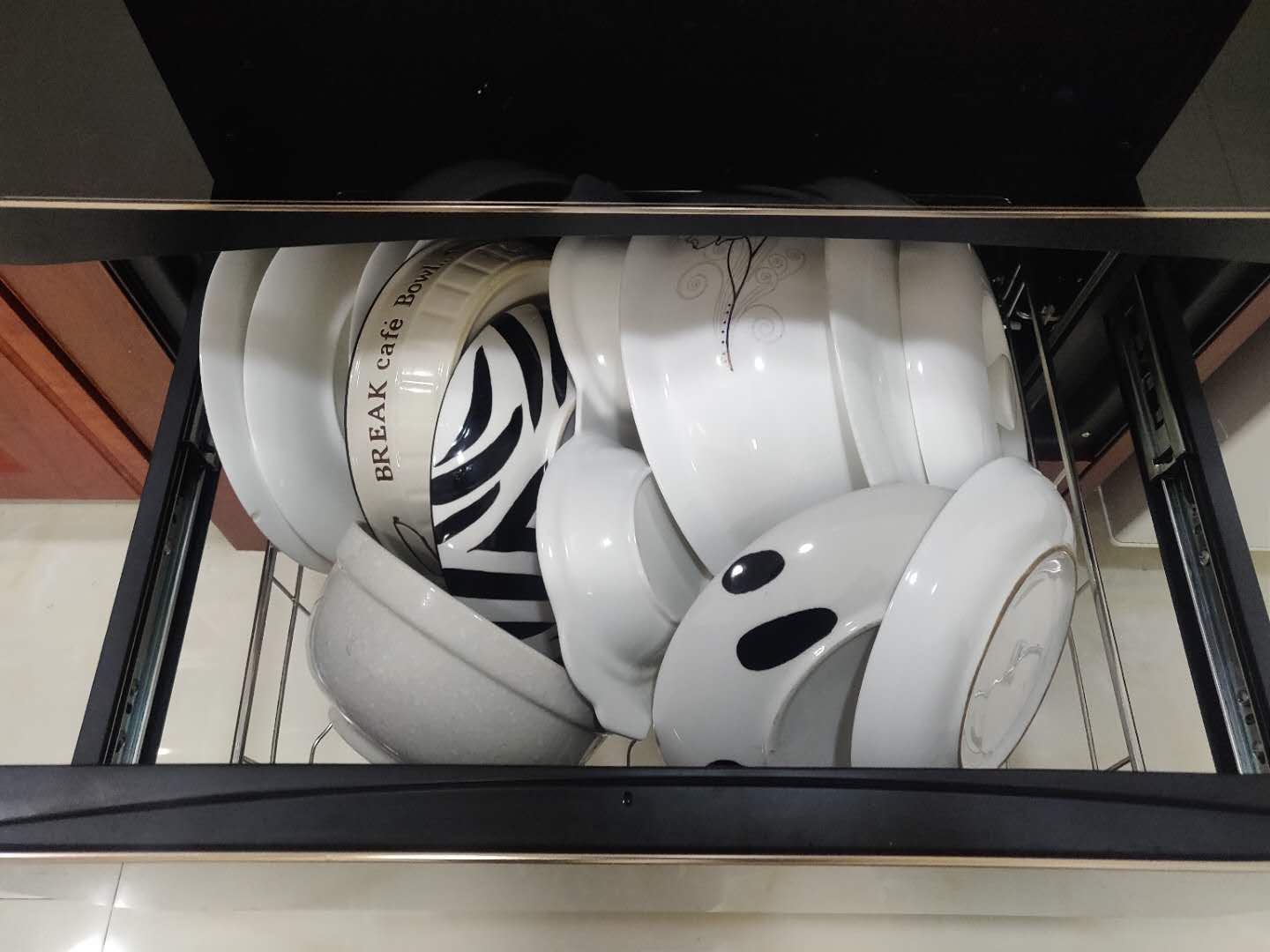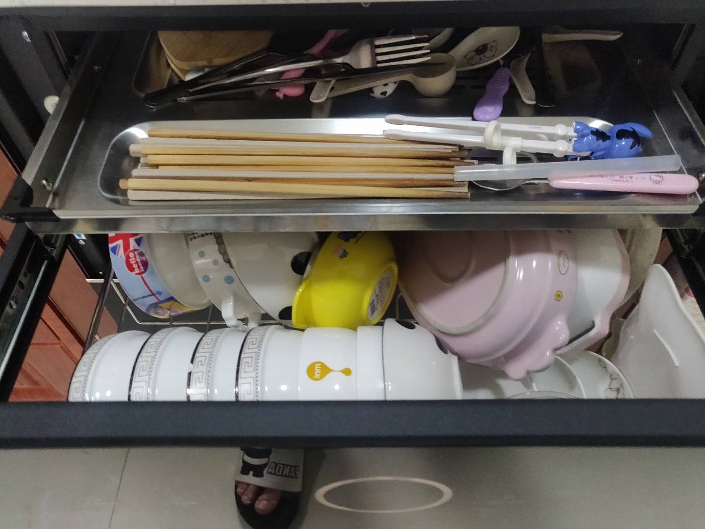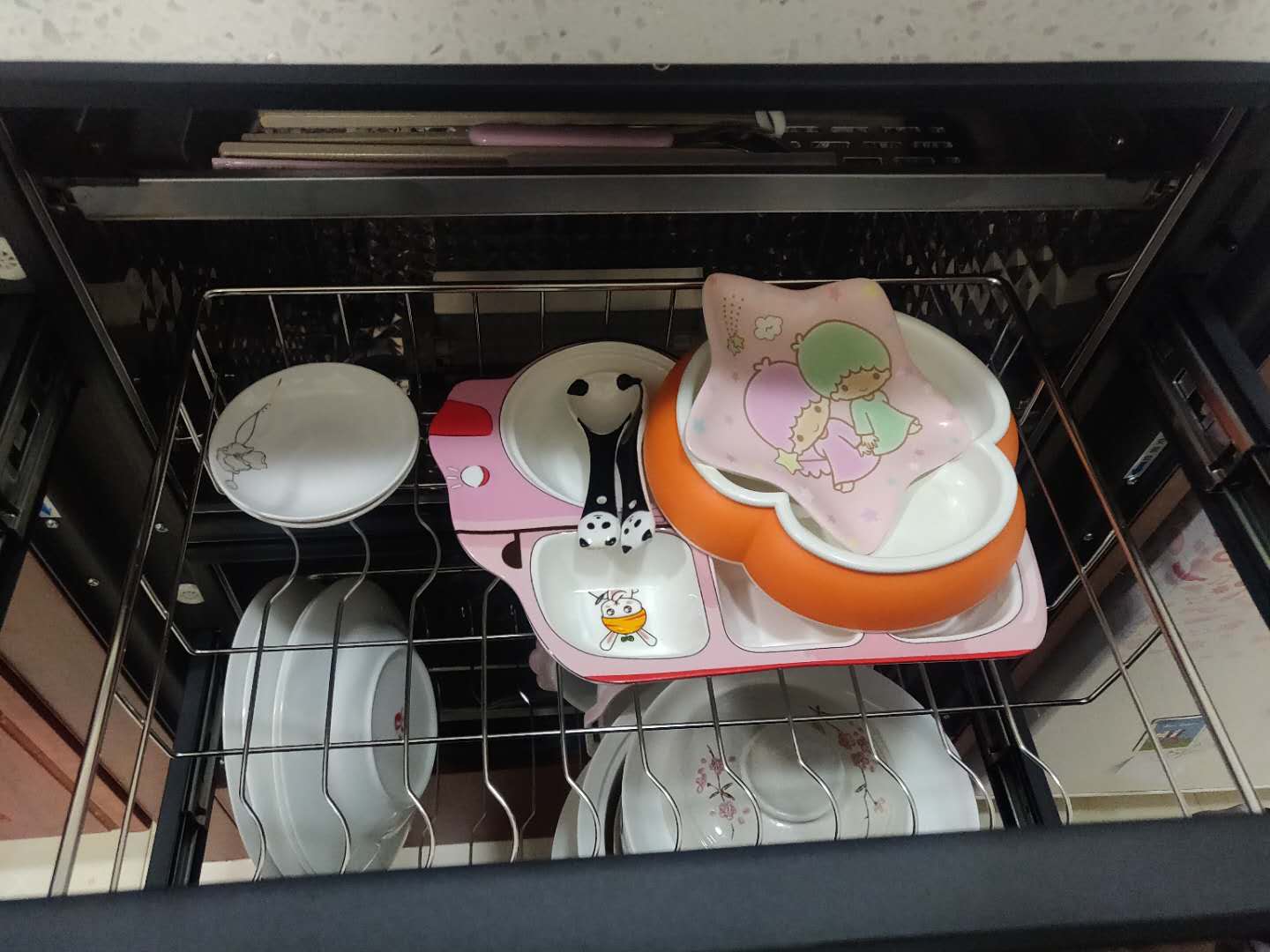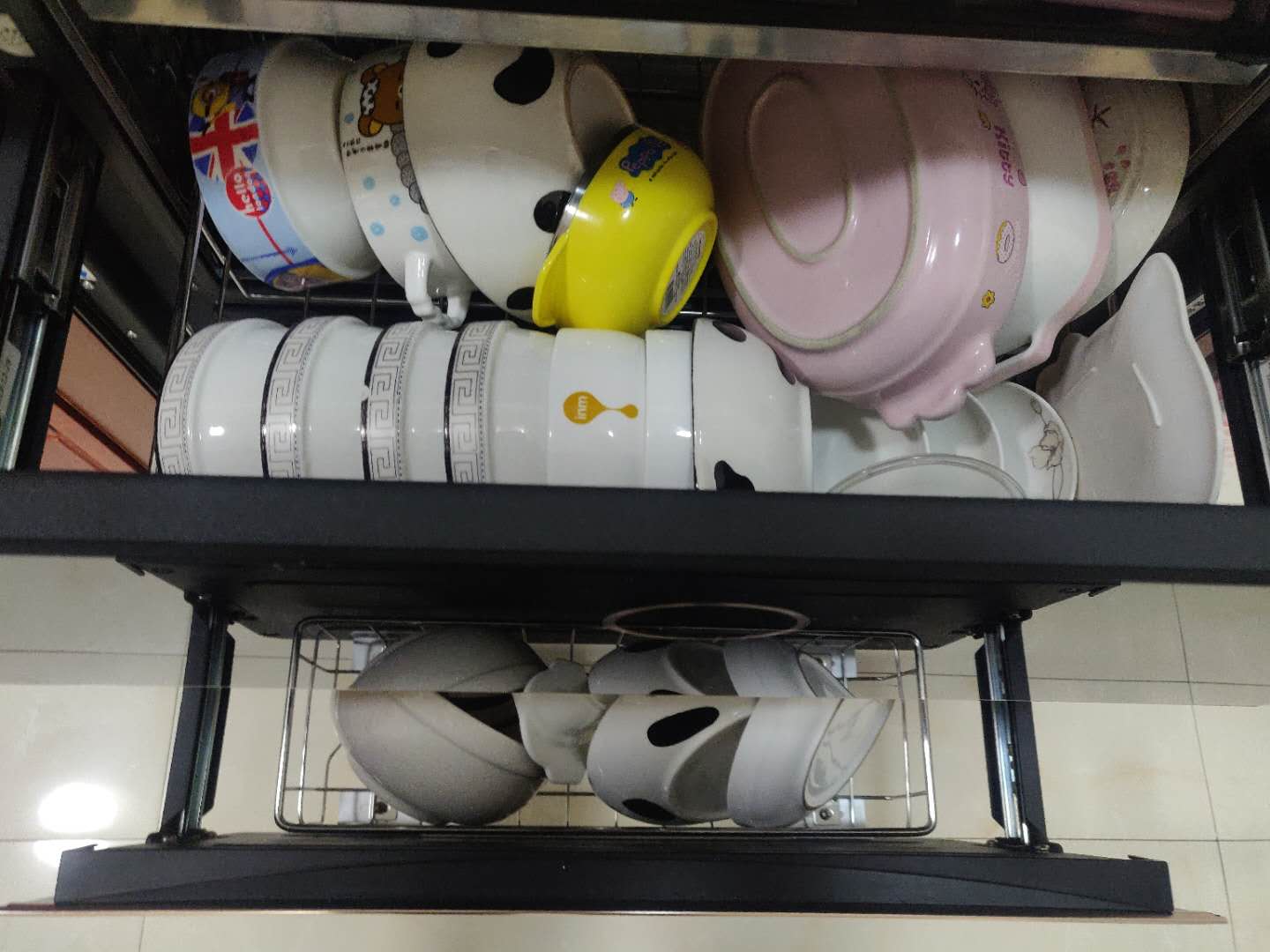 从目前的接触来看,做工还是很好的,而且可以将碗筷碟子都区分开,上层可以放碗和大一点的碟子,下层可以放很多普通厚度的碟子,这么看来存储的空间真的很大,以后家里的橱柜可以不用专门留出放碗碟的地方啦,哈哈~